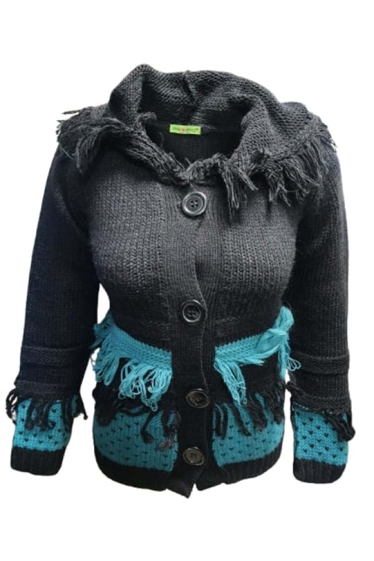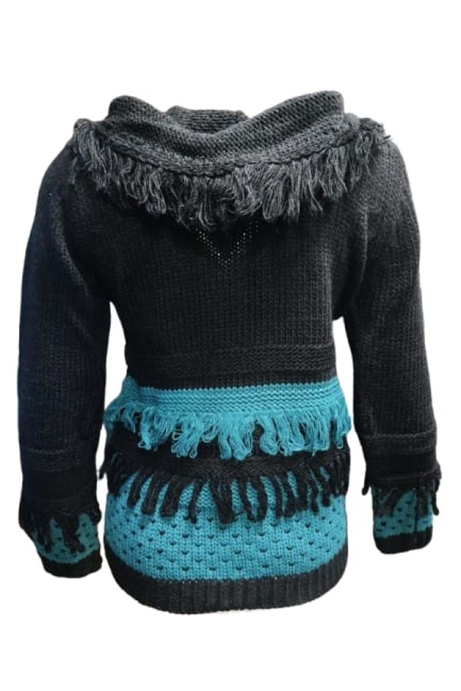 Pink Apple P00130 Kadın El Örgü Önü Püsküllü Kapüşonlu Hırka - Siyah